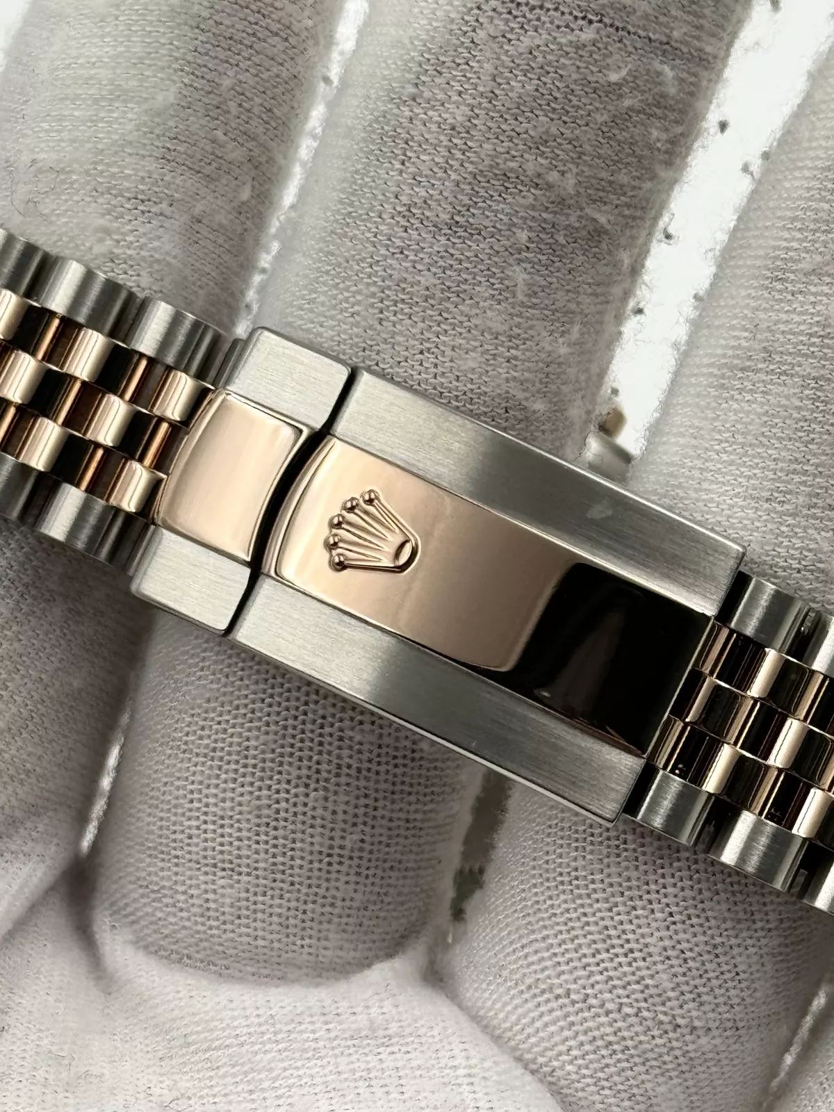 The watch is paired with a Jubilee bracelet, combining Oystersteel and 18k Everose gold for a two-tone effect that enhances its versatility and comfort. The bracelet is equipped with a concealed Crownclasp, ensuring a secure and seamless fit on the wrist.