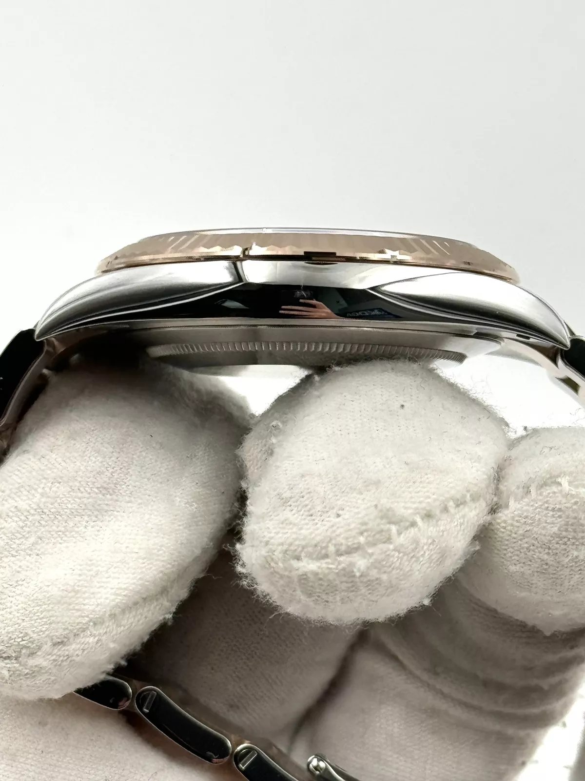 The 41mm Oyster case combines the durability of Oystersteel with Rolex’s proprietary 18k Everose gold, providing both resilience and a touch of opulence. The fluted bezel in Everose gold adds a classic touch to the watch, catching light with every movement and enhancing its refined character. With water resistance up to 100 meters, this Datejust is prepared for both formal occasions and everyday adventures.