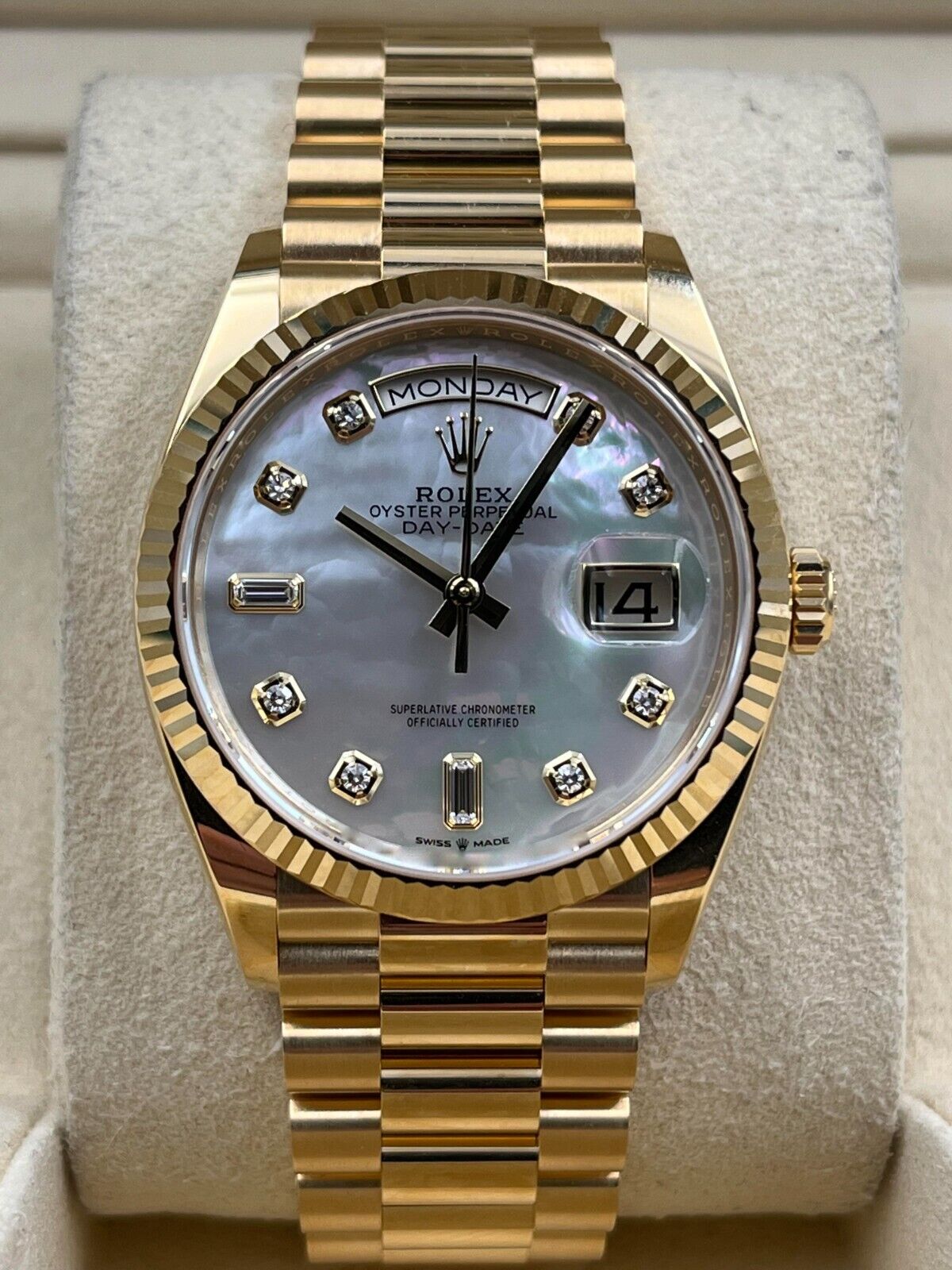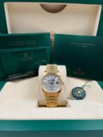 Introducing the Rolex Day-Date 128238 (Year: 2023) – a testament to timeless design and precision. This piece features a mother of pearl dial, yellow gold bracelet, and 36 mm yellow gold case, making it a statement piece that effortlessly captures attention.