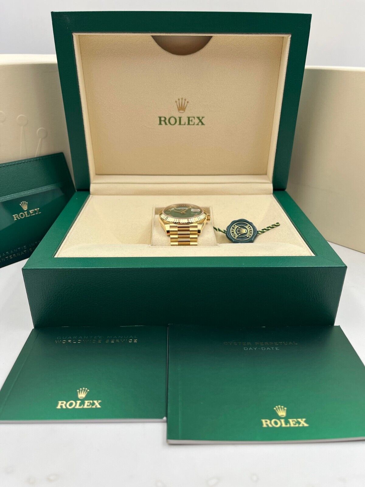 Introducing the Rolex Day-Date 228238 (Year: 2024) – a testament to timeless design and precision. This piece features a green dial, yellow gold bracelet, and 40 mm yellow gold case, making it a statement piece that effortlessly captures attention.