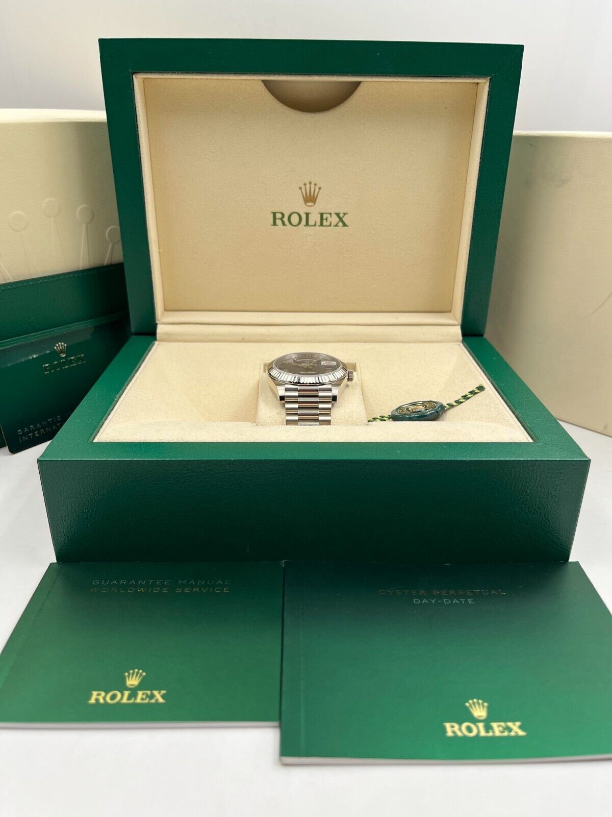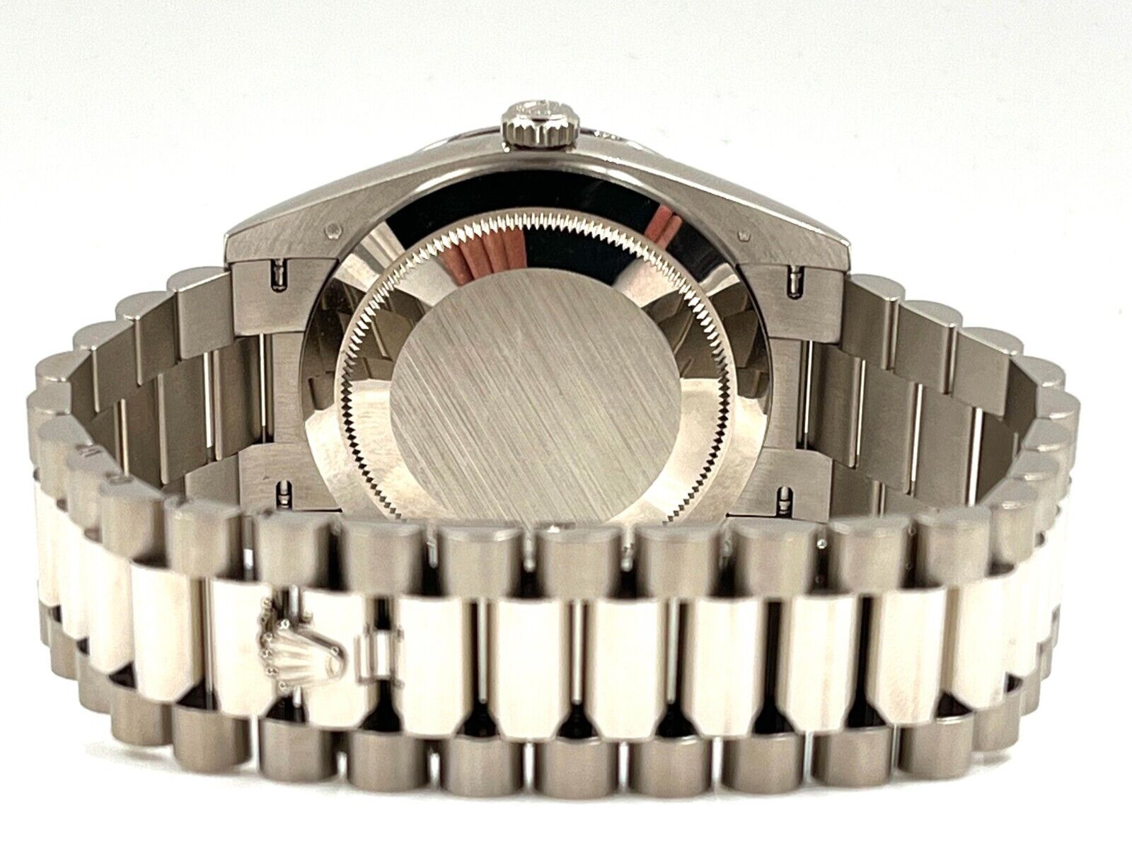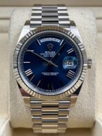 Introducing the Rolex Day-Date 228239 (Year: 2023) – a testament to timeless design and precision. This piece features a blue dial, white gold bracelet, and 40 mm white gold case, making it a statement piece that effortlessly captures attention.