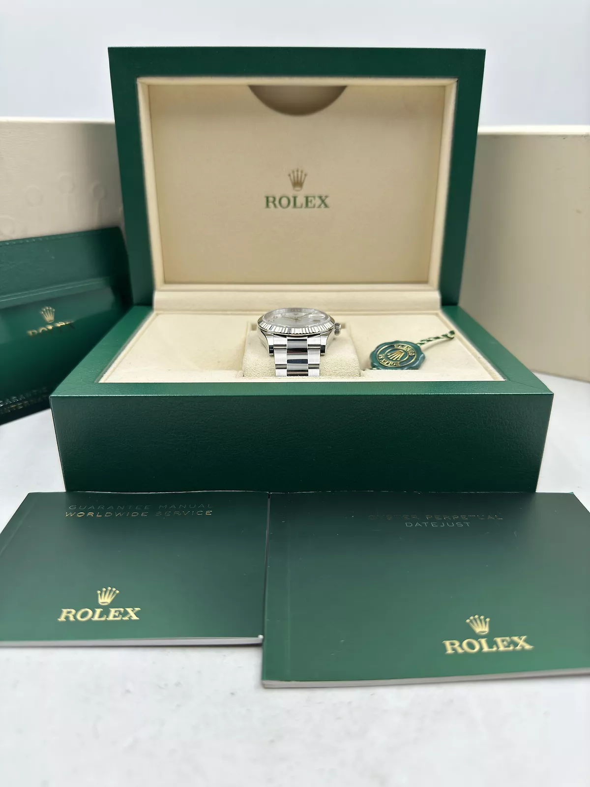 Introducing the Rolex Datejust 36 126234 (Year: 2024) – a testament to timeless design and precision. This piece features a green dial, two tone white gold/stainless steel bracelet, and 36 mm steel case, making it a statement piece that effortlessly captures attention.