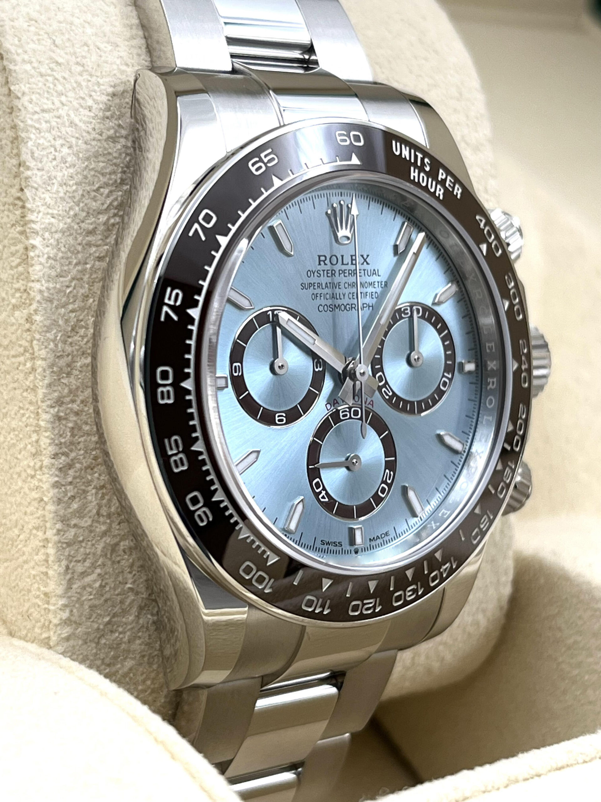 This watch is 100% Unworn and comes with the Original Box, Booklets, Green Chronometer Tag, and Warranty Card. The watch does not come with the bezel protector nor the white serial tag. The warranty card was dated and all of the stickers were removed from the watch at the time of the original purchase from the Rolex Authorized Dealer. The bracelet may have been sized at the time of the original purchase but the watch comes with all links that come standard on Rolex Daytona models.