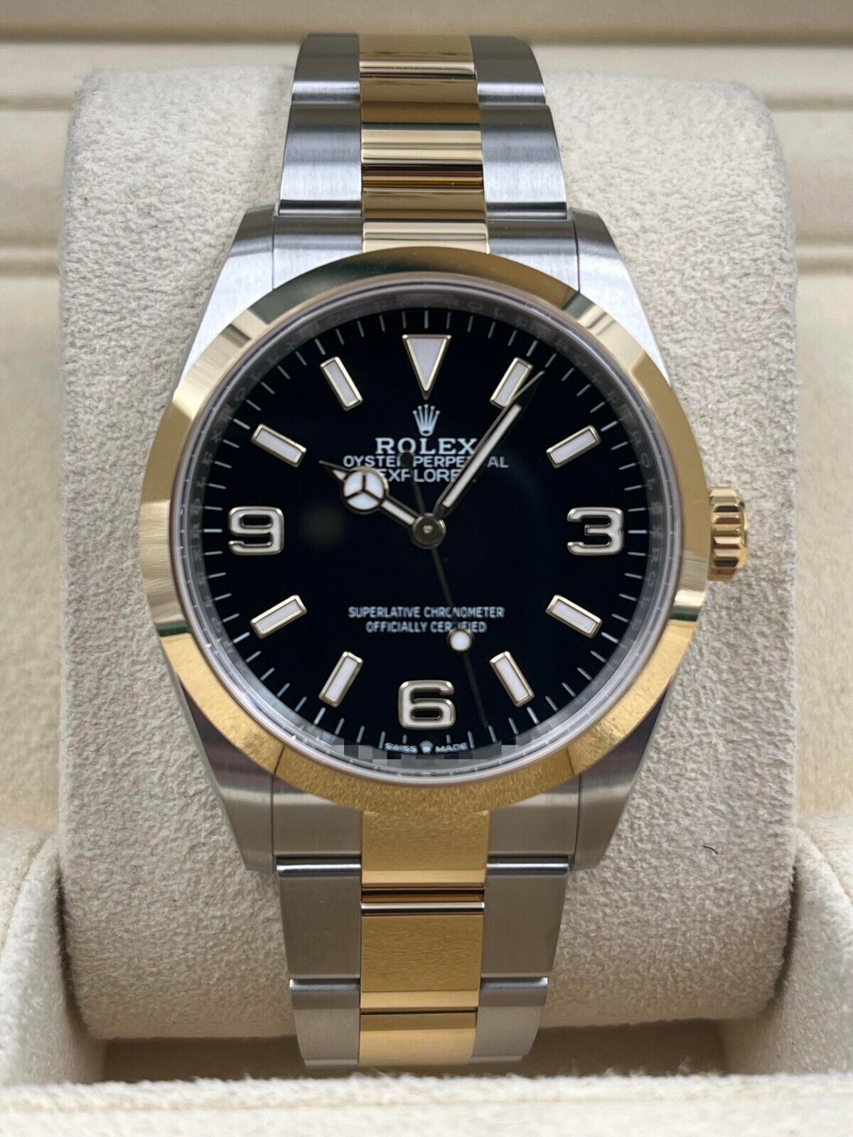 Introducing the Rolex Explorer I 124273 (Year: 2024) – a testament to timeless design and precision. This piece features a black dial, two tone yellow gold/stainless steel bracelet, and 36 mm steel case, making it a statement piece that effortlessly captures attention.