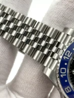 The sleek black dial provides excellent legibility, featuring luminous hour markers and Rolex’s signature Mercedes hands. The blue GMT hand, coupled with the bezel, allows seamless tracking of an additional time zone, ideal for frequent travelers. The date window at 3 o’clock, magnified by Rolex’s Cyclops lens, enhances functionality without disrupting the dial’s clean design.