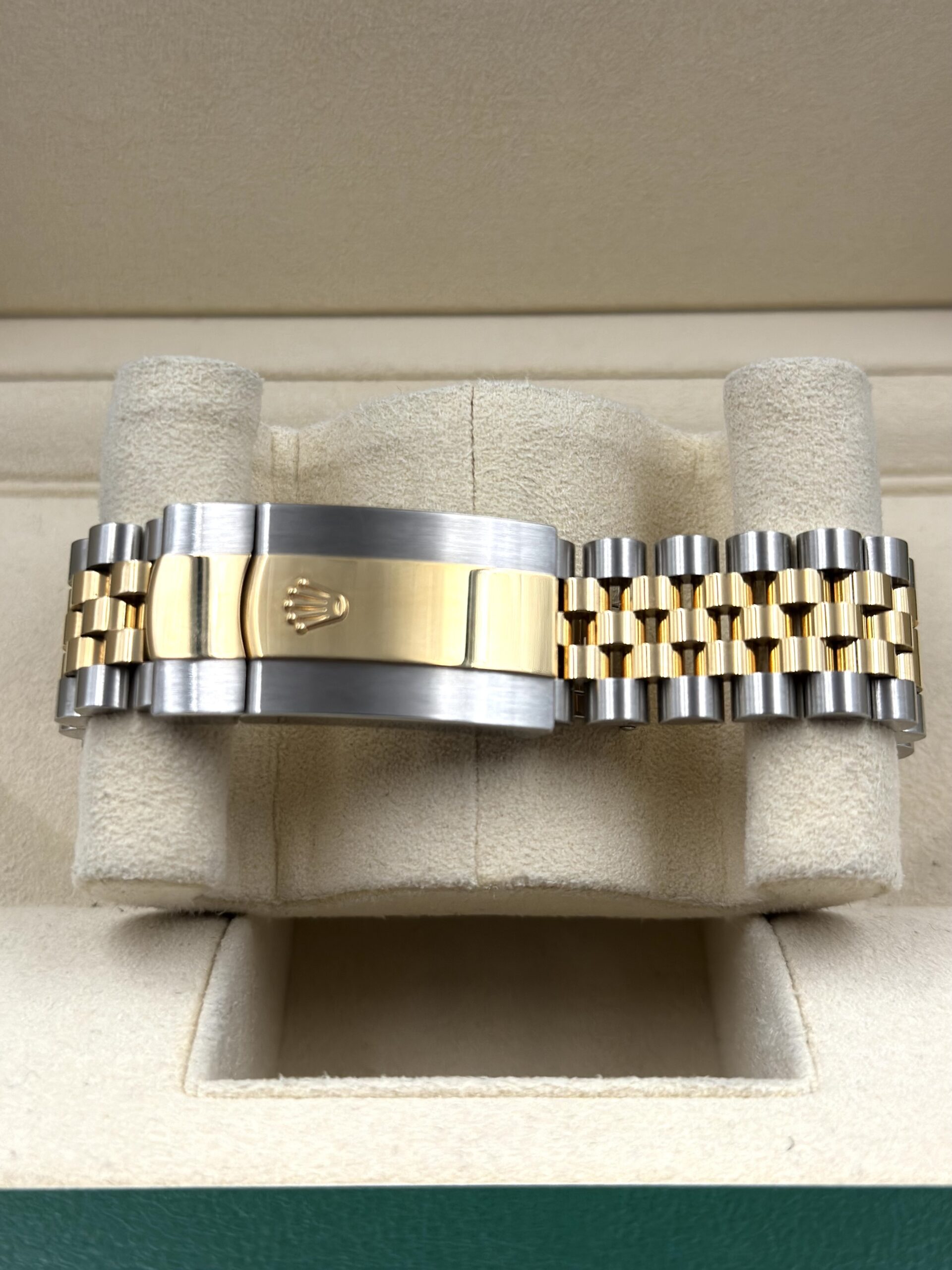 The Jubilee bracelet on this Sky-Dweller (Ref. 336933) elevates the watch’s elegance. This five-link bracelet, crafted from a combination of stainless steel and 18k yellow gold, offers a comfortable and supple fit on the wrist. The polished center links complement the overall luxurious aesthetic, while the concealed clasp ensures a seamless look.