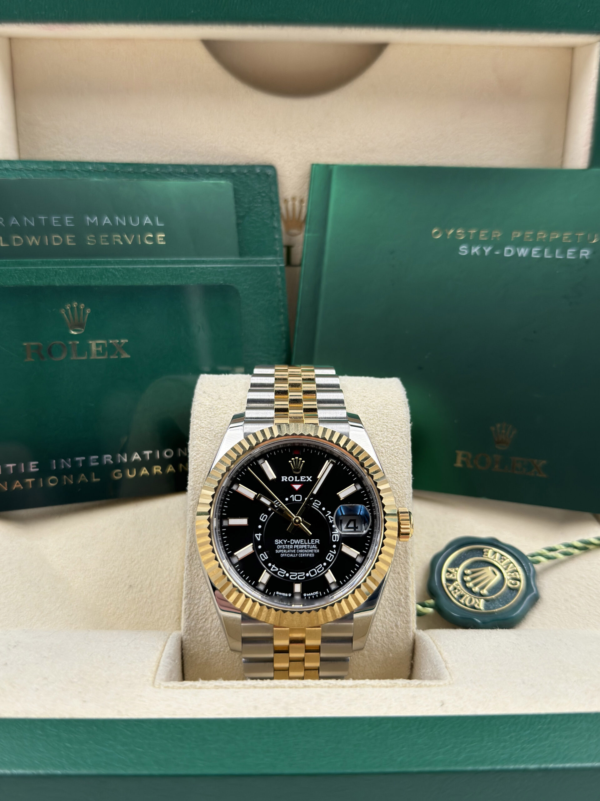 The Rolex Sky-Dweller (Ref. 336933) with a black dial and Jubilee bracelet is more than just a timepiece; it’s a symbol of innovation and luxury crafted for the modern traveler. With its robust construction, ingenious functionality, and sophisticated design, this watch is sure to become a treasured companion for those who navigate across time zones in style.