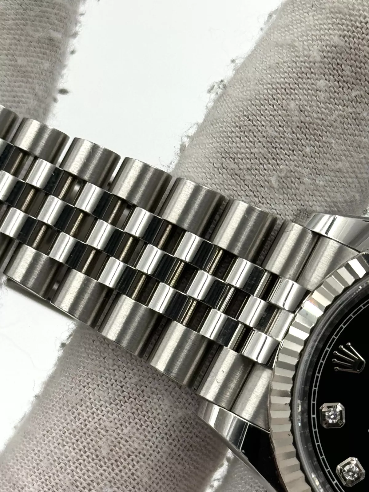 The deep black dial is the highlight of this model, with 10 brilliant-cut diamond hour markers set in 18k white gold for a touch of understated luxury. The silver-tone hands and Rolex crown add to the refined aesthetic, while the date window at 3 o’clock, magnified by the Cyclops lens, provides practicality without compromising the clean design.