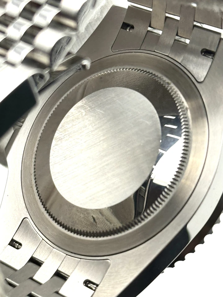 The 36mm Oystersteel case is paired with a signature 18k white gold fluted bezel, creating a sophisticated two-tone effect that enhances the watch’s timeless design. The polished finish adds a touch of elegance, while the scratch-resistant sapphire crystal and Twinlock crown ensure water resistance up to 100 meters, making this timepiece durable enough for everyday wear.